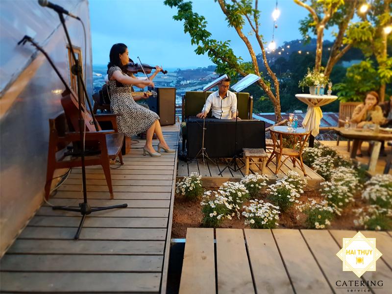 Giữa không gian tiệc cưới nên thơ thì âm nhạc là một thứ không thể thiếu, những bản nhạc acoustic nhẹ nhàng, những giai điệu không lời hay giao hưởng cổ điển, vô cùng thích hợp với bầu không khí ngoài trời, góp phần lãng mạn và ngọt ngào hơn cho buổi tiệc. Thậm chí, các thành viên gia đình, bạn bè hay khách mời của bạn… có “máu nghệ sĩ” thì bạn có thể thiết kế một chương trình ca nhạc mang phong cách “cây nhà lá vườn”, vừa mang được dấu ấn riêng và tạo sự ấm cúng, thân mật cho buổi tiệc.